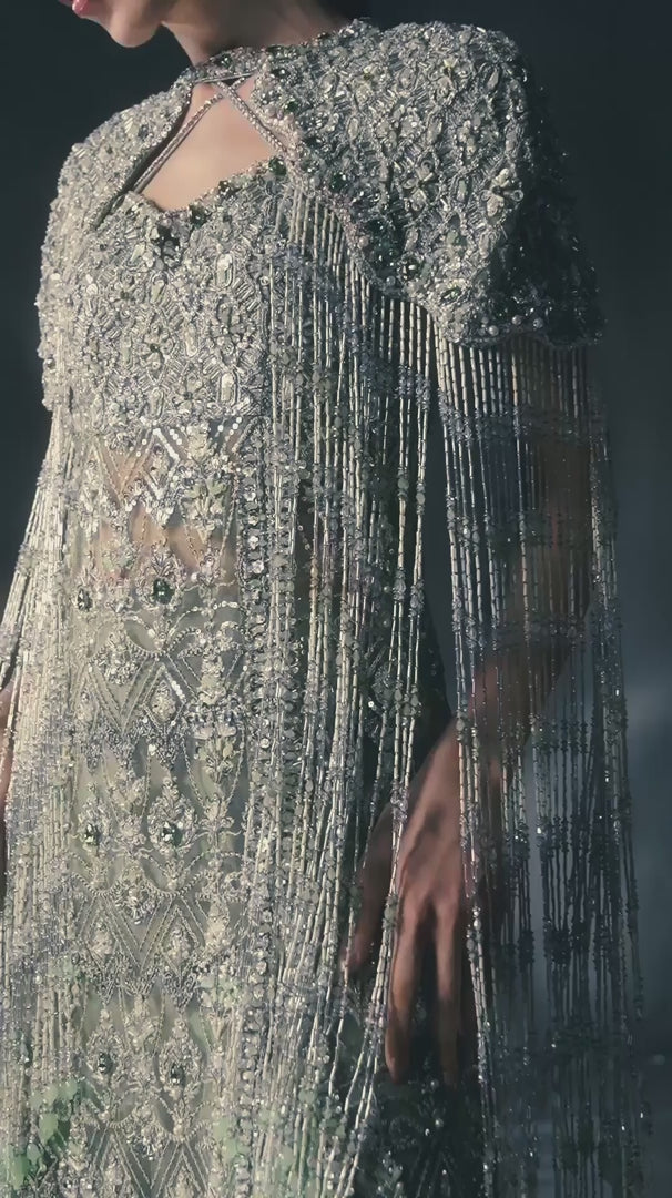 The one-sided slit dress flows effortlessly in sheer, ethereal net fabric, exuding sophistication and allure. The slit adds a bold yet refined touch, offering a tantalizing glimpse of movement and grace. Paired with an extravagant cape in matching net fabric, this ensemble is elevated to new heights of opulence. The cape cascades like a dream, adorned with intricate embellishments that shimmer with every step, making a statement of undeniable grandeur.