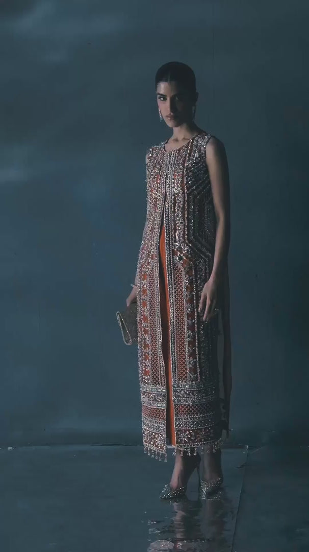 Elevate your style with this Orange Couture Ensemble, a perfect fusion of intricate craftsmanship and bold sophistication. The front-open organza shirt is richly embellished with shimmering crystals, Swarovski elements, sequins, and meticulous detailing, exuding elegance in every inch. Paired with a raw silk bustier and embellished raw silk culottes, featuring intricately adorned side slits with crystals and Swarovski accents, this ensemble is both striking and refined. Completing the look is a beautifully embroidered organza dupatta, featuring four-sided borders that add a touch of timeless grace. This vibrant ensemble is ideal for grand celebrations and special occasions, ensuring you shine with confidence and charm.